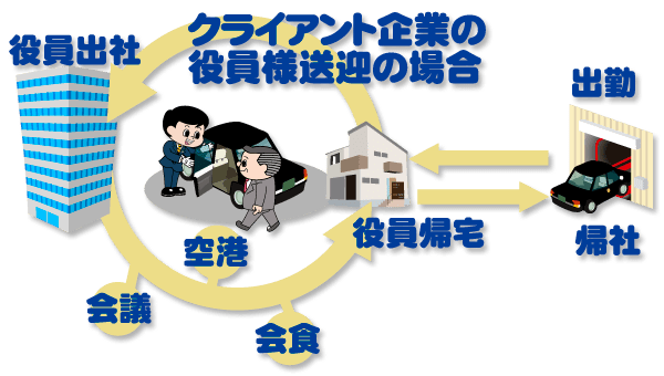 5:30に本社(西区)に出社6:00出発6:30企業の役員の方のご自宅前待機7:00役員の方を乗せクライアント企業へ8:00クライアント企業の待機室で待機